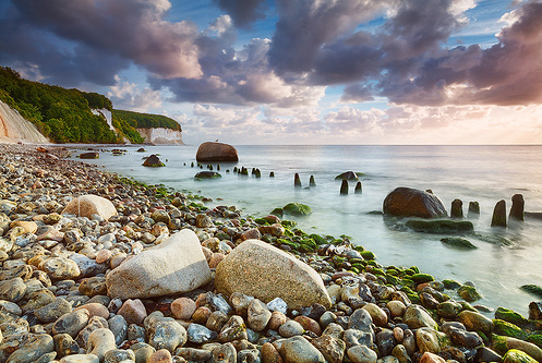 我们第二天到达之后,已经下午三点了。漫步海滨一个多小时后,搭上了去Sassnitz的火车(为了充分利用周票,哈哈)。一下火车,我就按着路牌奔向白垩岩Kreidefelsen方向,步行的话,需要大约四十分钟可以到达亚斯蒙德国家公园(Nationalpark Jasmund)入口,从此往下走三分钟即可到达石滩。沿着石滩,眺望波罗的海,一路前行。有很多漂亮的石头可以捡。